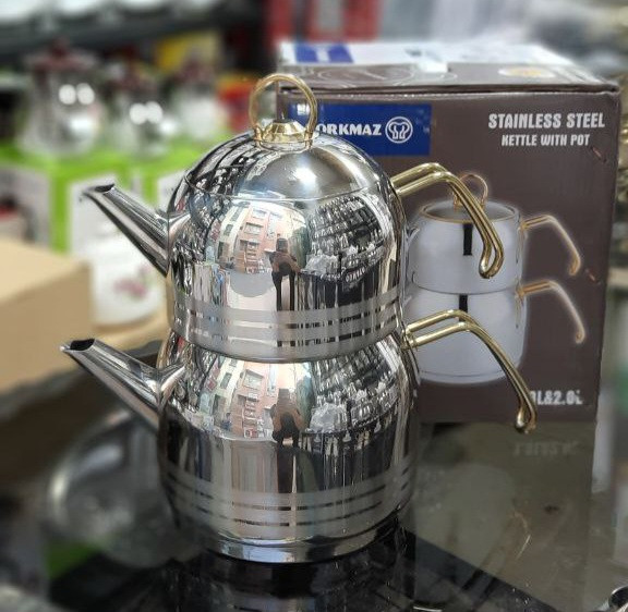کتری قوری تمام استیل کرکماز ترکیه ای، دارای کتری کف چدن با ظرفیت ۲ لیتر و قوری با ظرفیت ۱.۳ لیتر و بسته بندی عالی و کادویی کیفیت جنس عالی