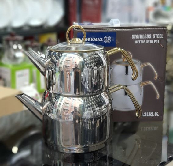 کتری قوری تمام استیل کرکماز ترکیه، کف چدن، کتری و قوری از جنس استیل با کیفیت و ضد زنگ ، ظرفیت کتری ۲ لیتر و ظرفیت قوری ۱.۳ لیتر با بسته بندی شیک و کادویی